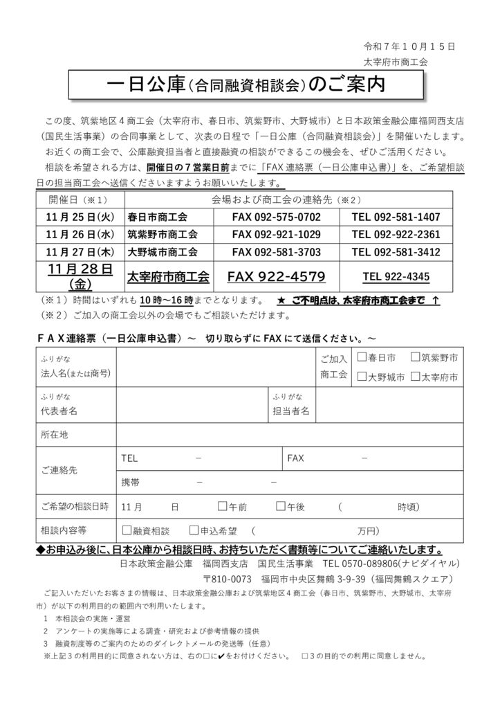 この度、筑紫地区4商工会(太宰府市、春日市、筑紫野市、大野城市)と日本政策金融公庫福岡西支店(国民生活事業)の合同事業として、別添PDFの日程で「一日公庫(合同融資相談会)」を開催いたします。お近くの商工会で、公庫融資担当者と直接融資の相談ができるこの機会を、ぜひご活用ください。相談を希望される方は、開催日の7営業日前までに「FAX 連絡票(一日公庫申込書)」を、ご希望相談日の担当商工会へ送信くださいますようお願いいたします。