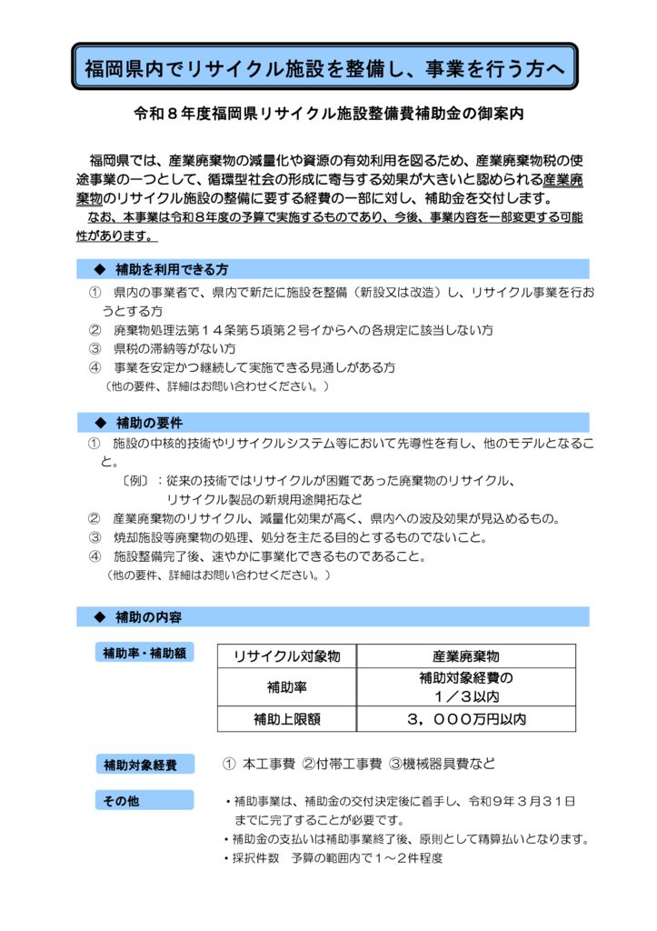 令和8年度福岡県リサイクル施設整備費補助事業計画の募集について