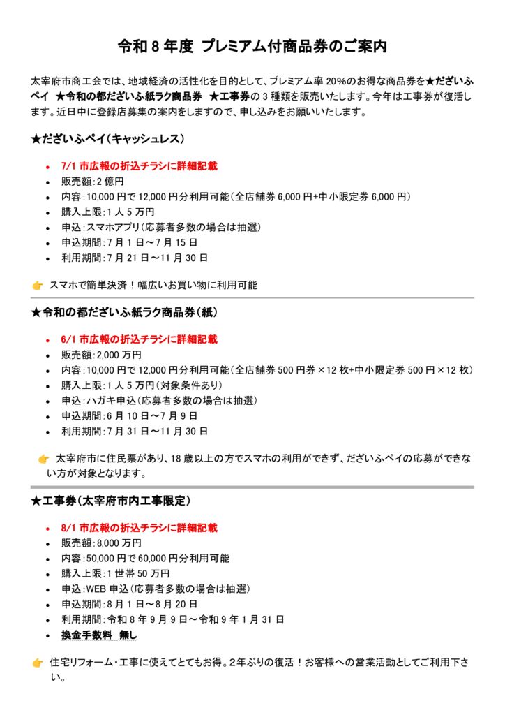 太宰府市商工会では、地域経済の活性化を目的として、プレミアム率 20%のお得な商品券を★だざいふペイ ★令和の都だざいふ紙ラク商品券 ★工事券の 3 種類を販売いたします。今年は工事券が復活します。近日中に登録店募集の案内をしますので、申し込みをお願いいたします。