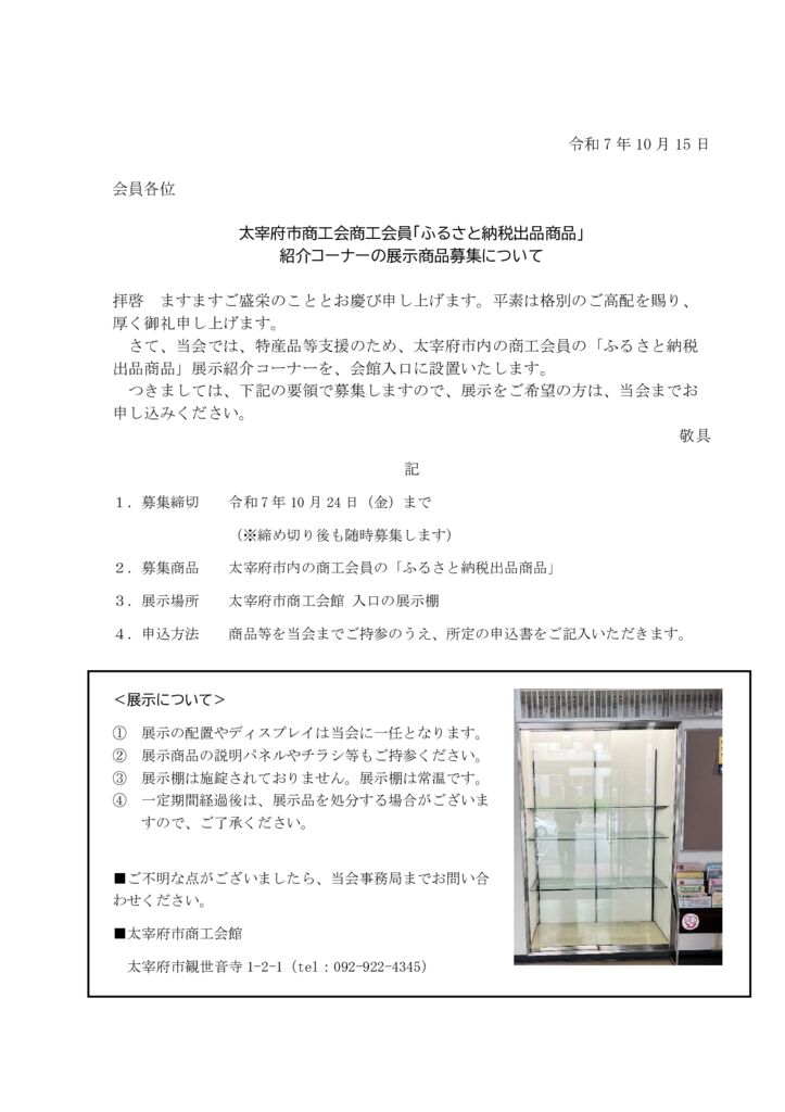 当会では、特産品等支援のため、太宰府市内の商工会員の「ふるさと納税出品商品」展示紹介コーナーを、会館入口に設置いたします。つきましては、下記の要領で募集しますので、展示をご希望の方は、当会までお申し込みください。